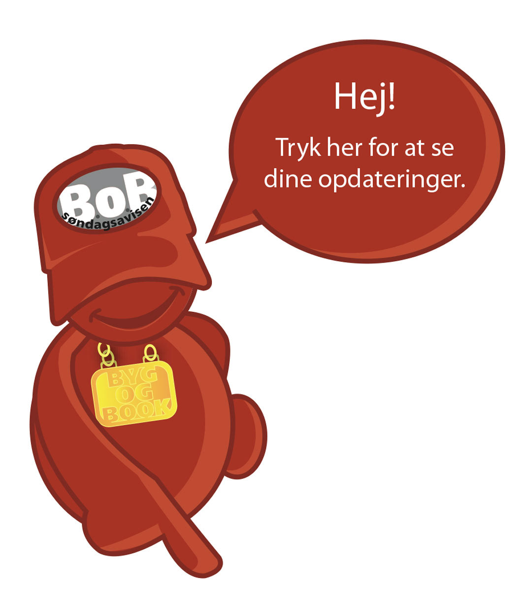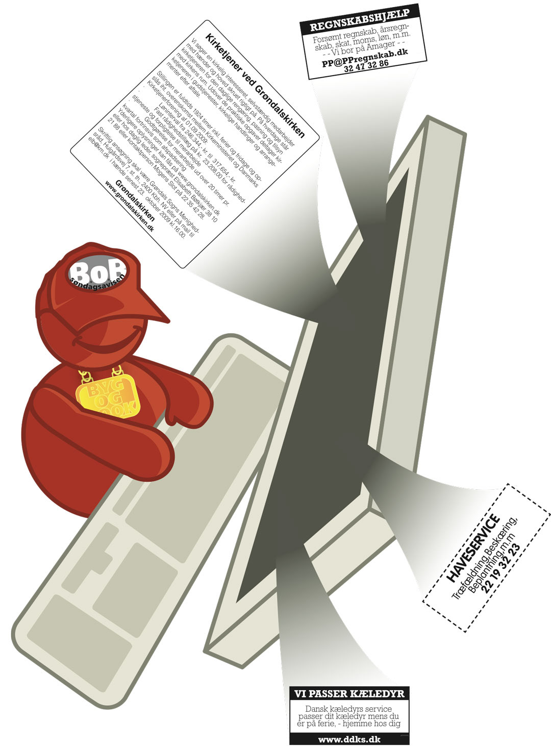Digital online info hjælpe figur til Søndagsavisens selvbygger program med annoncer, som kunderne selv kan fremstille ud fra færdige skabeloner.